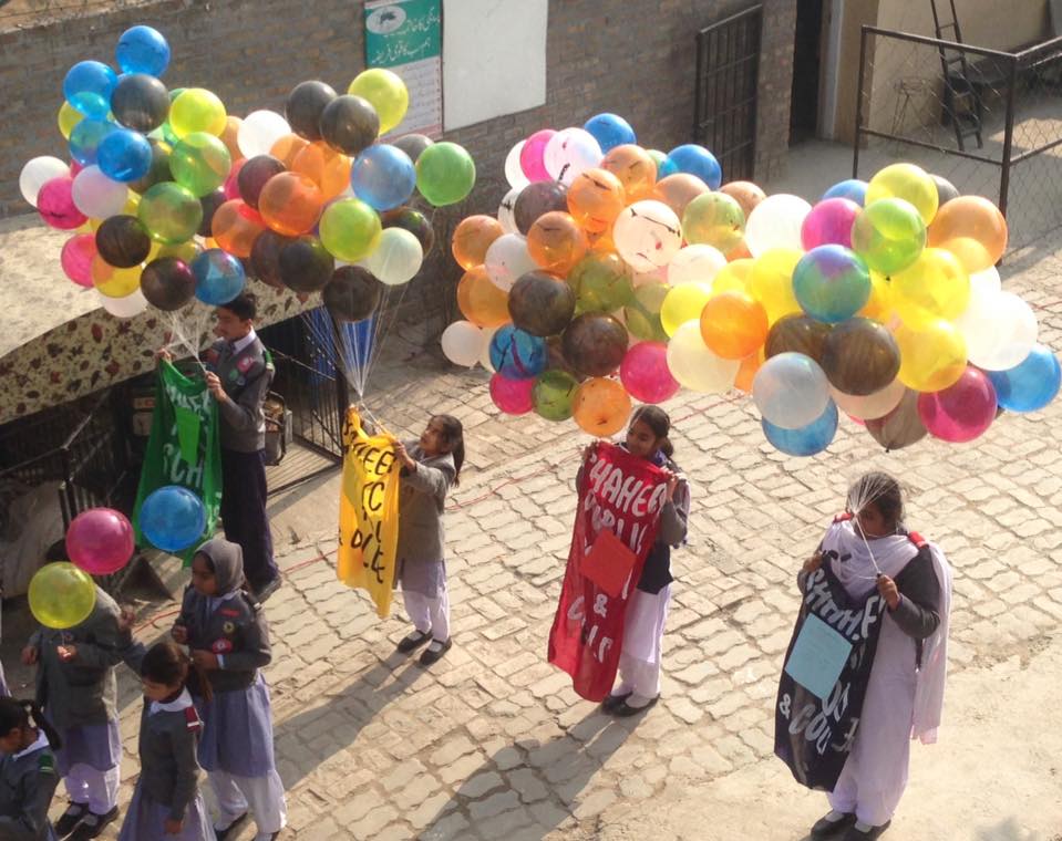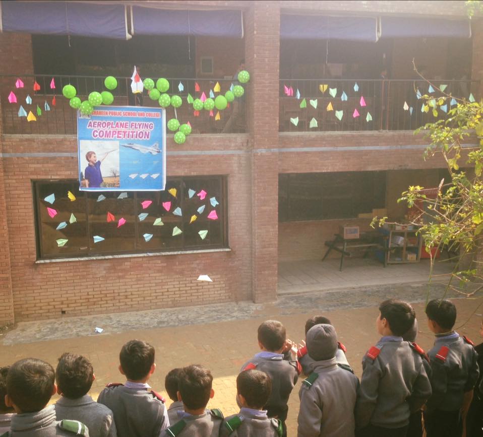 THE AEROPLANE FLYING AND BOOK- READING DAY 2017 The BOOK-READING Day has become a regular annual feature at Shaheen. The objective of this practice is to encourage book reading habit among the students. The aeroplane flying is an added attraction of the day. On 25nd January, 2018, a beautiful sunny day, the programme started after the break time, with the students assembling in the playground for the aeroplane flying competition. student pilots had been shortlisted for flying their aeroplanes on the day. After the aeroplane flying, the students moved to the Book-Reading ceremony venue in the front lawn of the college. The last and the grand item balloons release. Some 500 balloons of different colours, carrying the names of the students who had qualified to join the book readers club, were released as the final show. AYESHA of class X-B won the title of The MISS BOOK 2017, followed by HASSAN IQBAL V111A as first runner up and KOUKAB III-B as second runner up for having the largest number of books during the year. The balloons started rising up in the sky, moving in easterly direction, presenting a wonderfully colourful view to all. The students reacted with shouts of joy and clapping, the balloons slowly disappearing in the blue sky background.